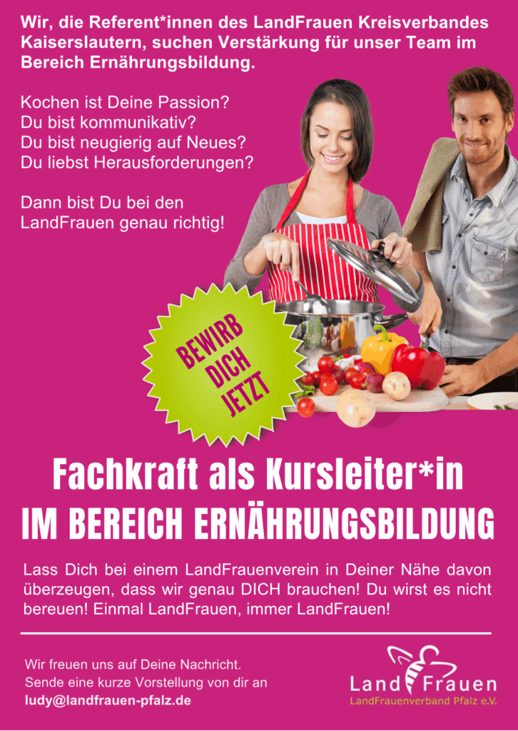 Wir freuen uns auf deine Nachricht und kurze Vorstellung von dir an ludy@landfrauen-pfalz.de .