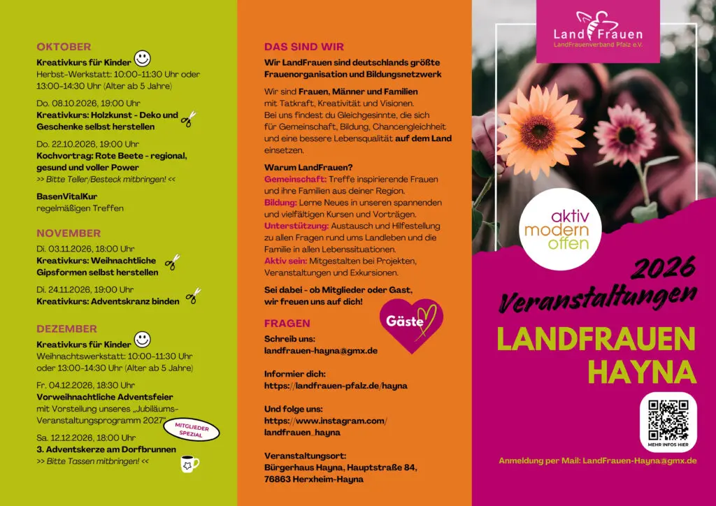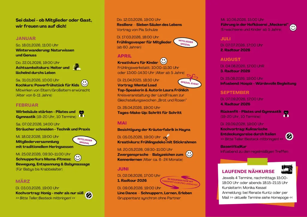 wir freuen uns, euch das vielfältige Jahresprogramm 2026 der LandFrauenverein Hayna e.V. vorstellen zu dürfen! Auch in diesem Jahr erwarten euch inspirierende Vorträge, kreative Workshops, gesellige Ausflüge, Fitnessangebote und besondere Veranstaltungen für alle Generationen.