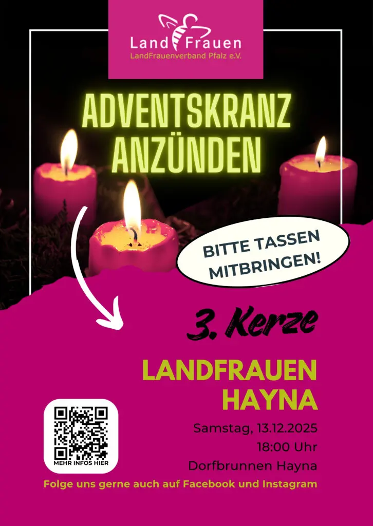 Auch in diesem Jahr zünden wir die dritte Kerze des großen Adventskranzes am Dorfbrunnen an. Wie immer ist für euer leibliches Wohl bestens durch uns LandFrauen gesorgt. Bitte denkt daran eure Tassen mit zu bringen!