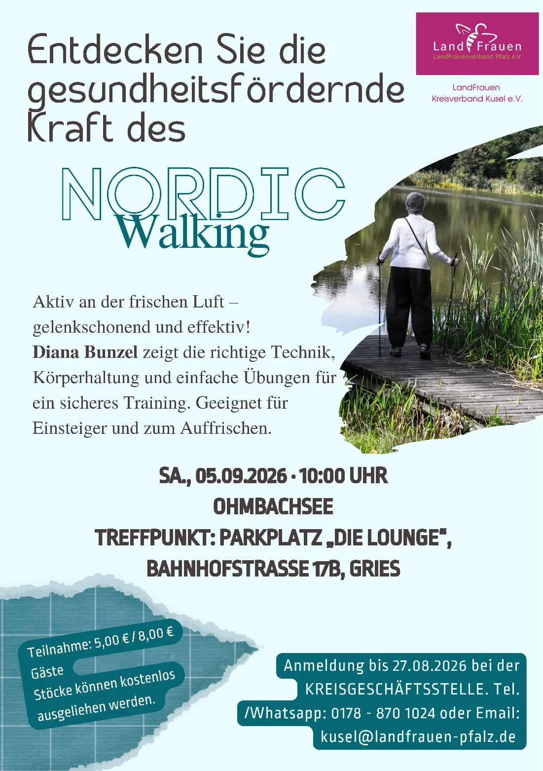 Entdecken Sie die gesundheitsfördernde Kraft des Nordic Walkings. In diesem rund vierstündigen Workshop vermittelt Diana Bunzel die Grundlagen der gelenkschonenden und effektiven Ausdauersportart. Ob Sie neu einsteigen, oder Ihre Technik auffrischen möchten – Sie sind herzlich willkommen. Neben praktischen Übungen legen wir Wert auf Körperhaltung, Atmung und ein Bewusstes Tempo. Auch kleine Mobilisationsübungen und Dehnübungen sind Teile des Programms. Ziel des Workshops ist es, Ihnen Sicherheit und Freude an der Bewegung zu vermitteln – damit Sie auch danach eigenständig trainieren können. Nordic Walking-Stöcke können vor Ort kostenlos ausgeliehen werden.