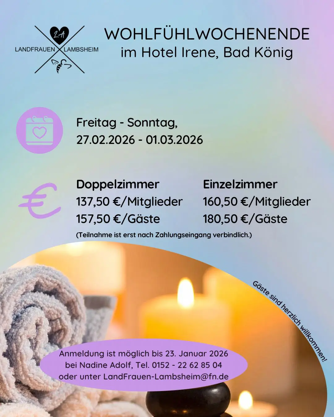 Weitere Kosten entfallen auf das Abendessen á la carte für Freitag und Samstag sowie für die Nutzung etwaiger gewünschter Wellness-Anwendungen.