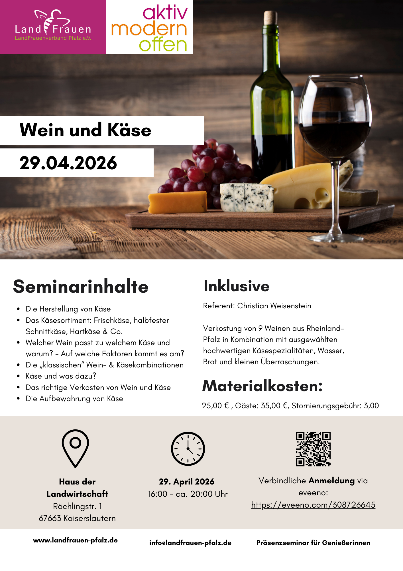 Anmeldung via eveeno: Wein und Käse am 29.04.2026 im Haus der Landwirtschaft, Kaiserslautern
